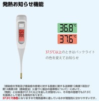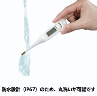 【特徴】 ・バックライト付きですので、暗い部屋でも見やすいです。 ・防水設計(IP67)のため、丸洗い可能です。 ・液晶表示は、平熱では緑色ですが、37.5℃以上になると赤くなります。 ・先端が柔らかく曲がるため、こどもや高齢者にも安心して使えます。 ・予測測定時間が20 秒と短いため、使い勝手が良いです。 【仕様】 ・サイズ(mm):141×24.5×15 ・入数:1本 ・測定方式:予測・実測式(脇下専用) ※腋下で測定した体温は、舌下体温と比べ0.3〜0.5℃程度低いのが一般的です。(個人差があります。) ・測定範囲:32.0〜42.0℃ ・測定精度:±0.1℃(恒温水槽で実測測定した場合) ・測定時間:予測/約20秒、実測/約10分 ・機能:前回値メモリ・バックライト表示・高温検知・ブザー音・オートパワーオフ ・防水性能:一部防浸形(JIS T1140:2014)/IP67 ・電源:CR1632×1個(テスト用付属) ・付属品:収納ケース ※管理医療機器(例外販売) 医療機器認証番号:303AKBZX00092000
